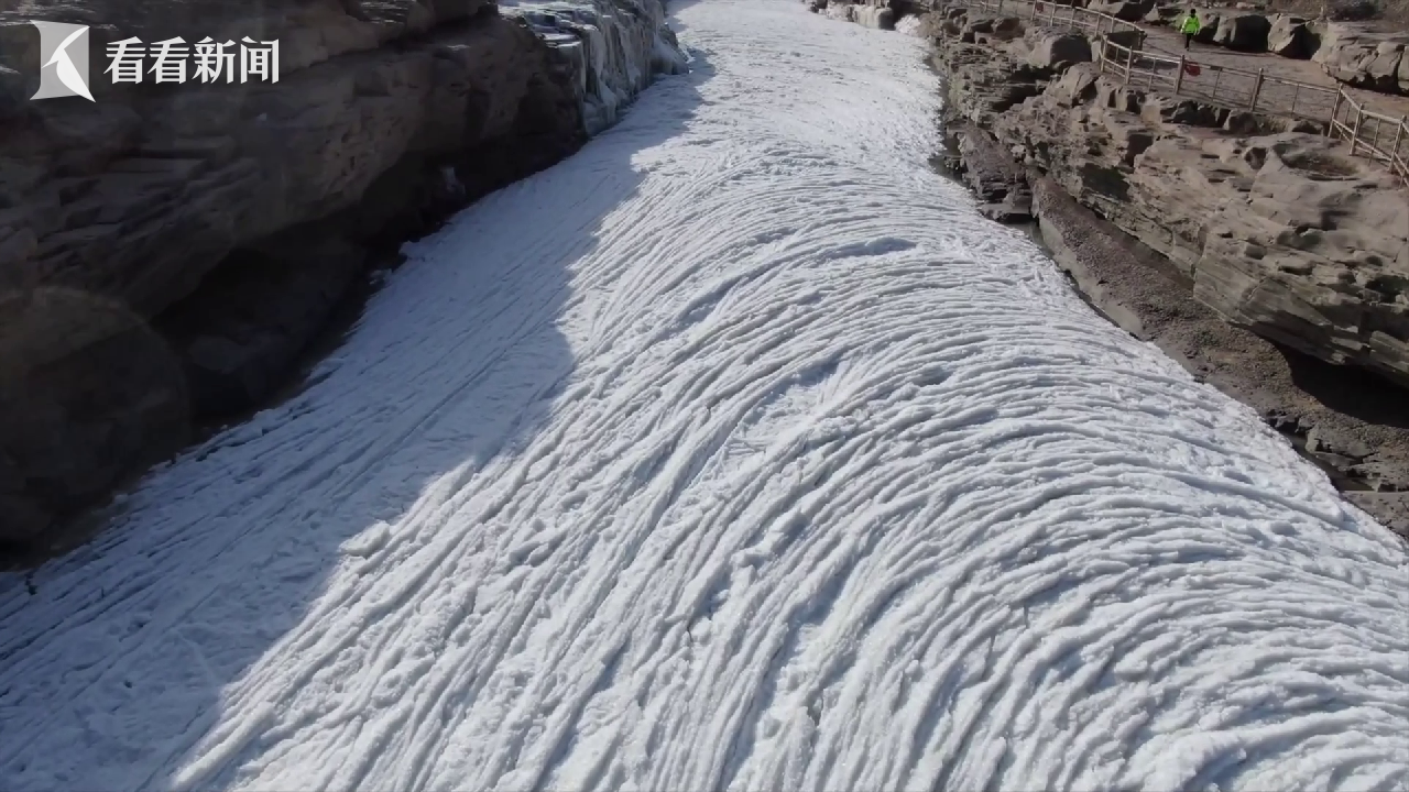 目前,黄河壶口段流凌封河的长度达到三公里。远远望去,宛若一条白色巨龙静卧在峡谷之中。为了确保游客安全,山西壶口瀑布景区加大了安保巡查力度,二十四小时监测凌情变化,并与上游水文站保持密切联系,确保壶口景区安全度过凌汛期。