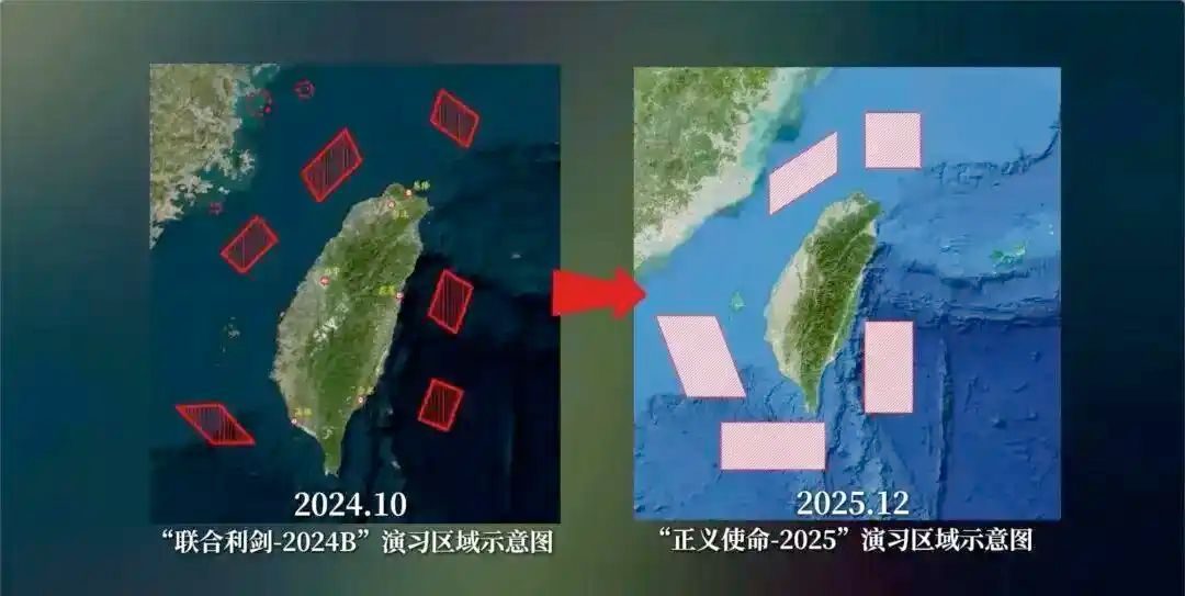 12月29日,中国人民解放军东部战区组织陆军、海军、空军、火箭军等兵力,位台湾海峡、台岛北部、台岛西南、台岛东南、台岛以东,组织“正义使命-2025”演习,重点演练海空战备警巡、夺取综合制权、要港要域封控、外线立体慑阻等科目,舰机多向抵近台岛,诸军兵种联合突击,旨在检验战区部队联合作战实战能力。