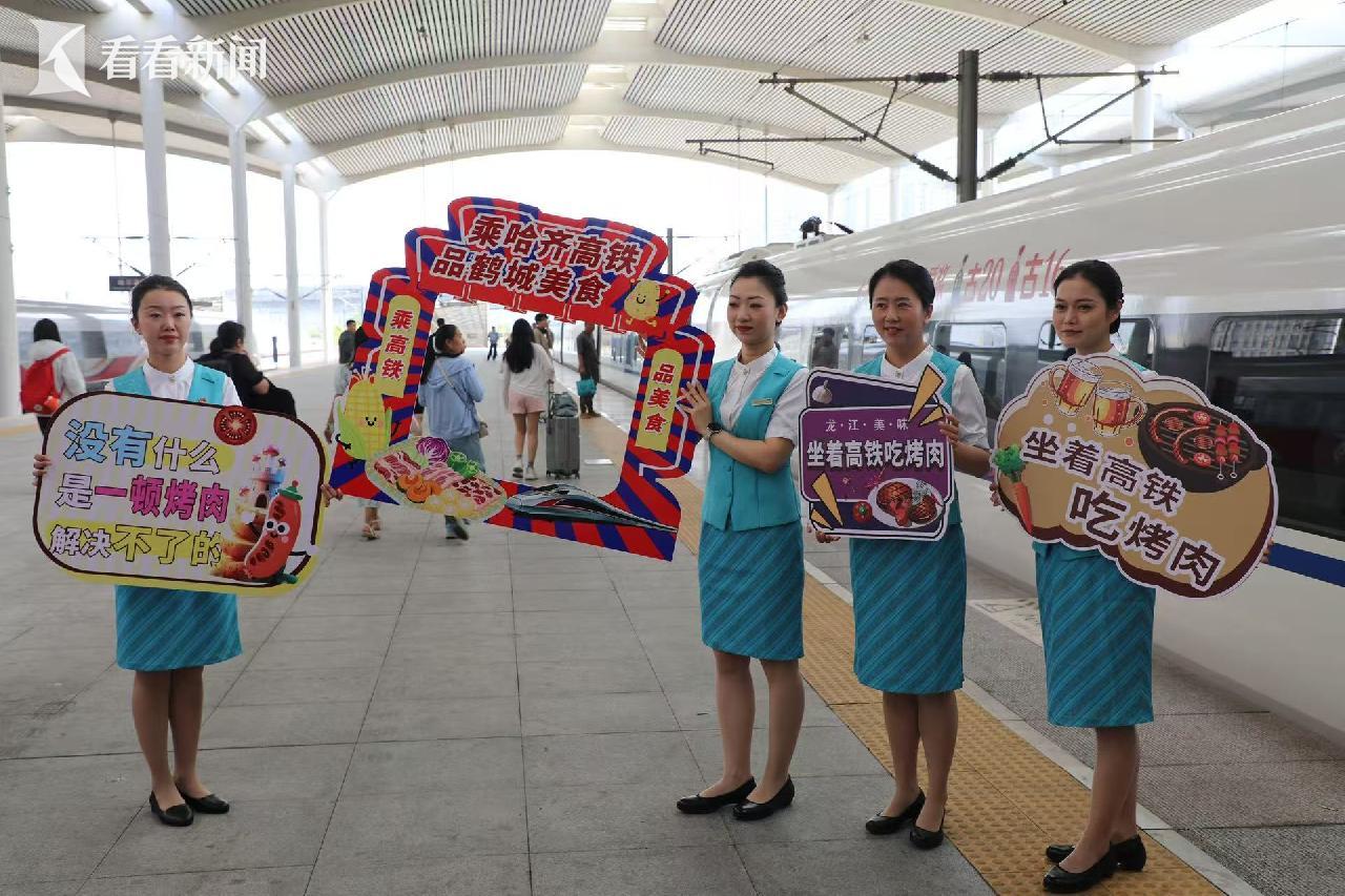 6月18日8时许,在哈尔滨西开往齐齐哈尔南的D6993次动车组列车上,烤肉“主厨”现场展示家庭拌肉,齐齐哈尔文旅“推荐官”为旅客赠送伴手礼,“乘哈齐高铁 品鹤城烤肉”的背景板前,旅客正兴致勃勃打卡拍照……这是中国铁路哈尔滨局集团有限公司为服务黑龙江省全域全季旅游发展, 创新开展的列车服务。