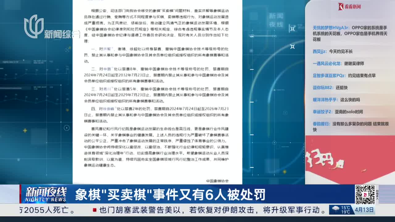 中国象棋协会:6名违规人员被处罚 洪智、谢靖、徐超因参与“买卖棋”被终身禁赛
