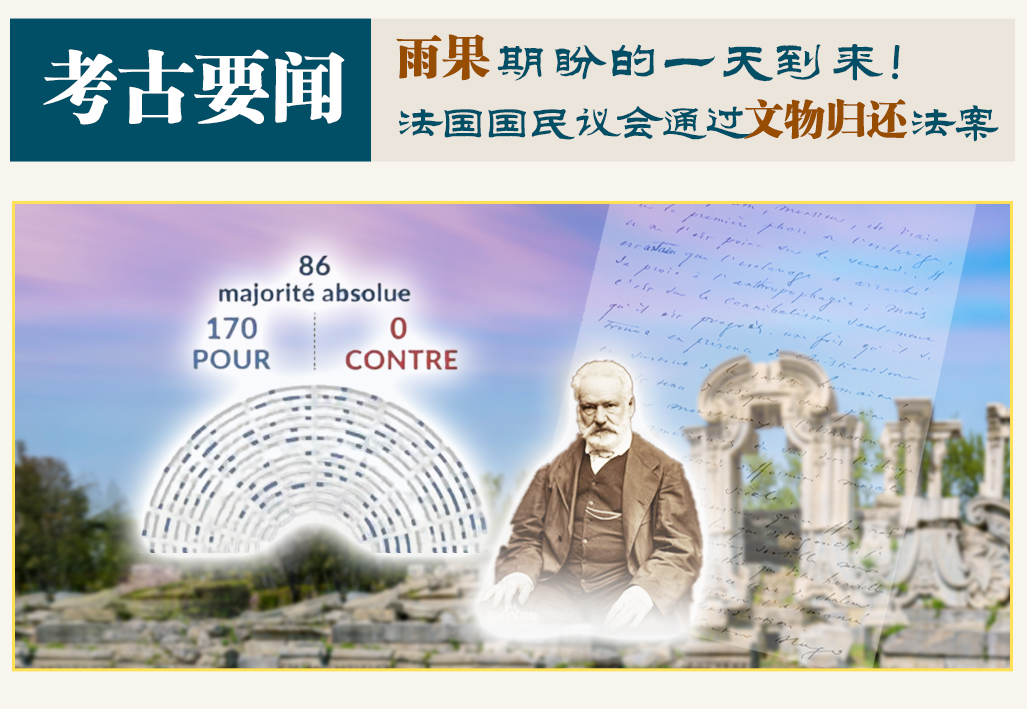 “两个强盗走进了圆明园,一个抢掠,一个放火……这两个强盗分别叫做法兰西和英吉利”,这是法国大文豪雨果在写信给巴特勒上尉时的痛斥。他在信中,表达了法兰西把不义之财归还中国的期盼。现在,雨果期盼的一天终于有望到来。法国国民议会以170票赞成、0票反对通过一项法案,将简化法国在1815年至1972年期间掠夺所得文物的归还程序。