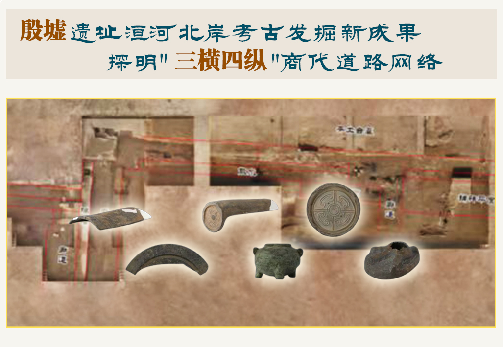 殷墟遗址公布近年的发掘成果:洹河北岸探明“三横四纵”商代道路网络,构成都城空间骨干框架,同时确认大邑商都城道路分宽、中、窄三级,可称为干道、街、巷。大邑商是商朝人对本国都城的美称。最新发现表明,周人灭商后虽将大邑商人群分别迁徙往四处,但仍把王陵区作为重点区域监控,这为推进“周人灭商”等相关研究提供了新的考古学证据。