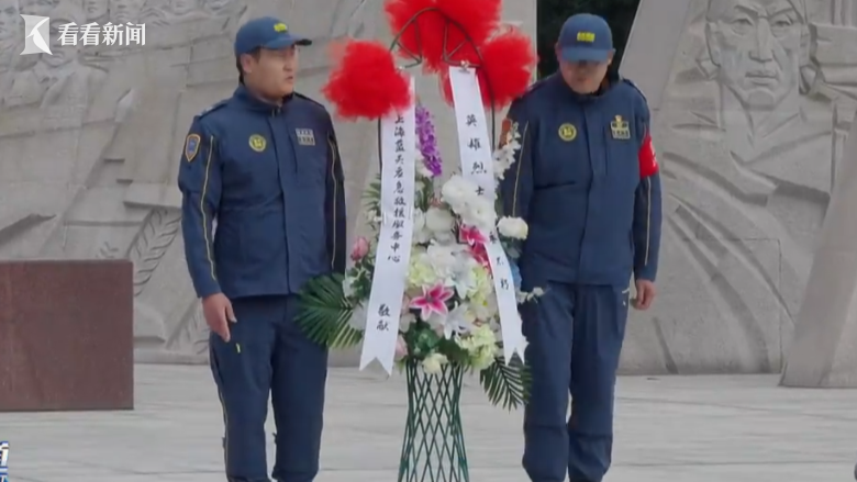 上海蓝天救援队的队员们列队步入陵园,向烈士们敬献花圈。
