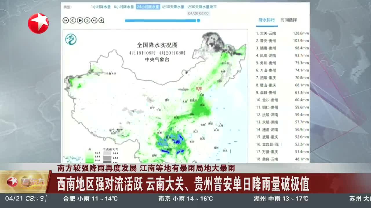 南方较强降雨再度发展 江南等地有暴雨局地大暴雨 西南地区强对流活跃 云南大关、贵州普安单日降雨量破极值