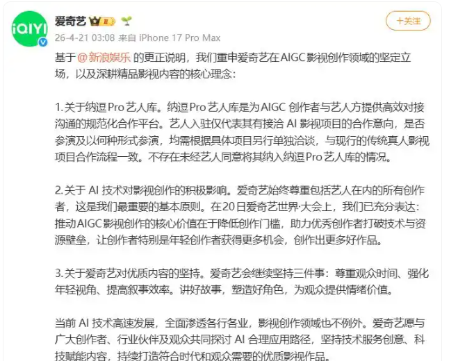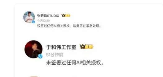然而,蓝图尚未展开,现实就给爱奇艺一记响亮的耳光。发布会刚刚结束的下午,一场辟谣风暴席卷而来。张若昀工作室率先发声,没有签过任何AI相关授权,法务正在紧急处理。于和伟、王楚然、李一桐紧随其后,一致否认曾签署任何AI授权协议。