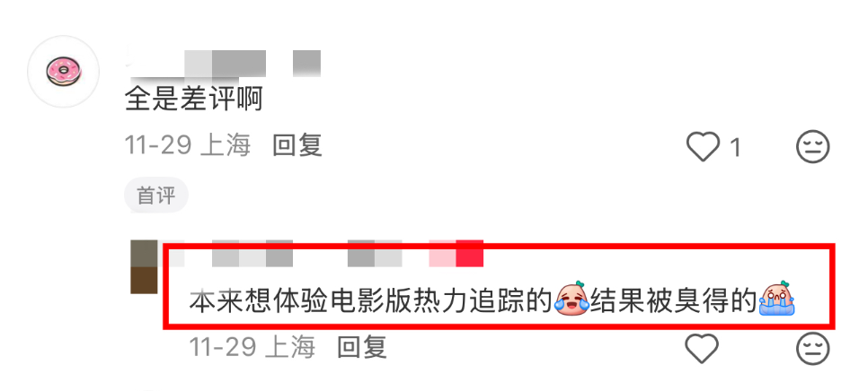 李女士说年初,自己也来这里看过4D电影《哪吒》,当时的体验很好,而这次却遭遇了"臭味攻击",不由得怀疑是院方维护不当所致。"我感觉可能这几个月4D影片排片比较少,所以就导致他们没有清理。"