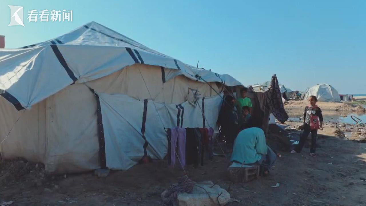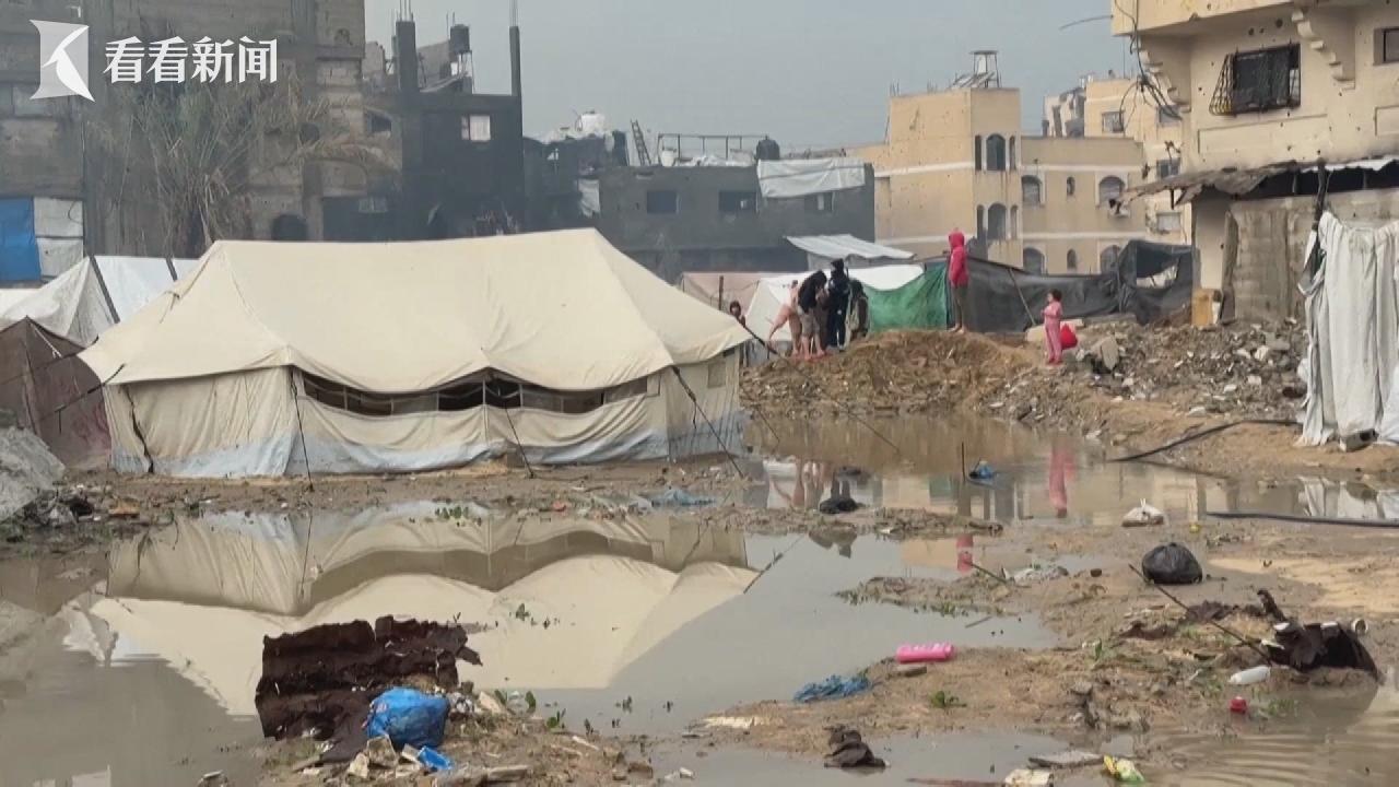 加沙难民哈尼·朱奈德描述道,大雨和严寒天气来袭后,帐篷区被水淹没,孩子们泡在水中,厨具和食物也全都进水,生活愈发艰难。