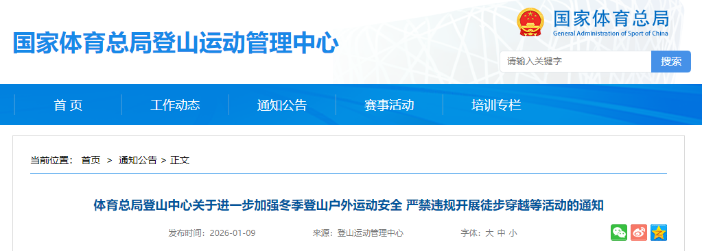 1月9日,国家体育总局登山中心发布关于进一步加强冬季登山户外运动安全 严禁违规开展徒步穿越等活动的通知。