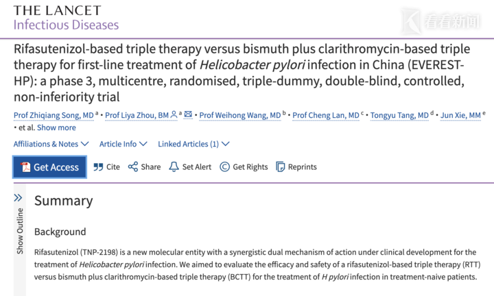 北京大学第三医院消化科周丽雅、宋志强教授团队带领全国40家医疗机构消化疾病诊疗中心,通过全球首个Ⅲ期临床试验,证实了含利福特尼唑的三联方案,比临床上常用的铋剂四联方案具有更高的根除成功率和更低的不良反应发生率,而且用药更少,服用更方便,将为全球幽门螺杆菌感染者带来了全新的治疗选择。相关成果日前于《柳叶刀-感染病学》在线发表。