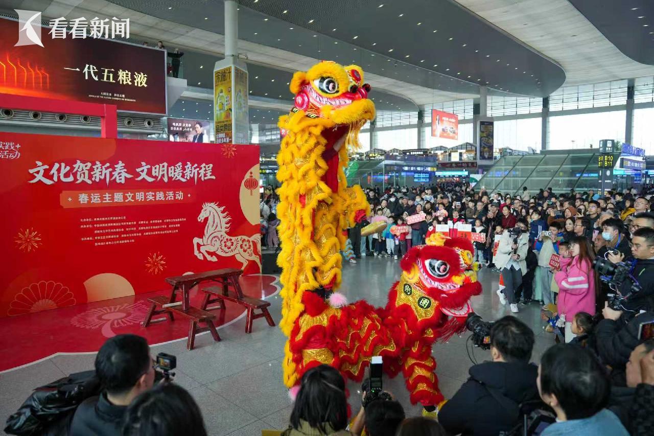 在喧闹的锣鼓声中,成都东站候车大厅内,舞狮、歌曲演唱、非遗表演轮番上演,春运首日,这场丰富的站房文艺汇演,让旅客在轻松愉快的氛围中,踏上回家之旅。而通过回答春节传统文化、文明过节等相关题目,旅客还能获得书法家现场书写赠送的对联和福字。