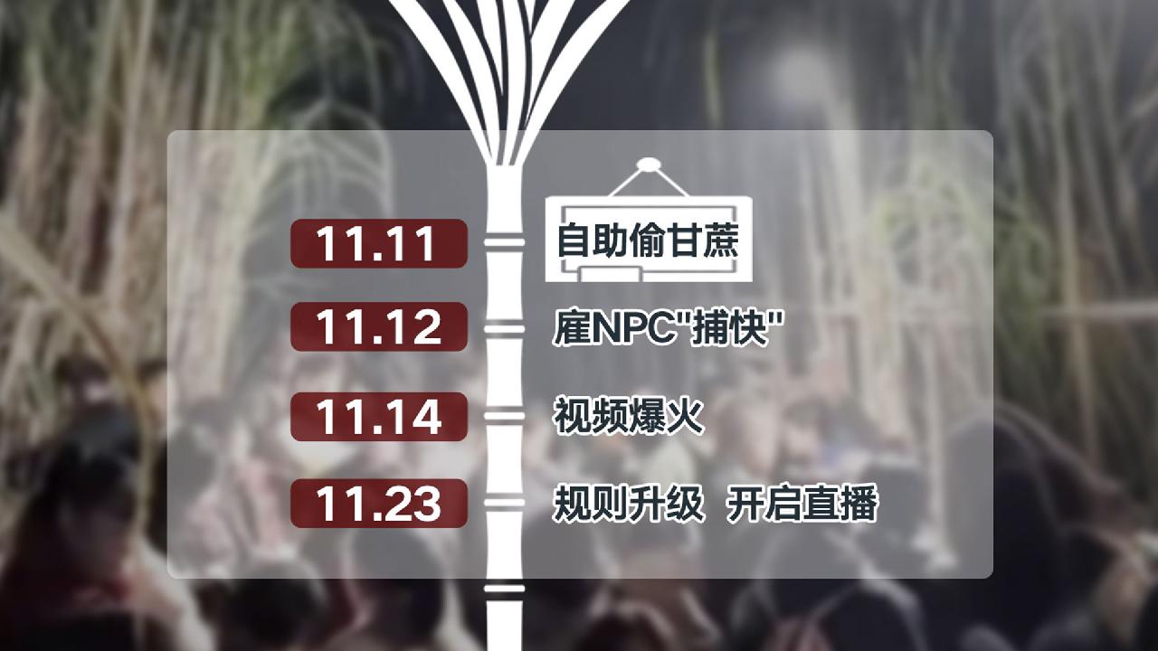 从11月11日推出“偷甘蔗”项目,到昨天改规则增设入场费,游客的热情始终高涨,昨晚8点,童鹏飞的社交账号开启直播,当晚现场游客超过千人。有游客表示,要只是卖甘蔗,未必会去买,但让自己去“偷”,还有人来追捕,就充满了趣味。
