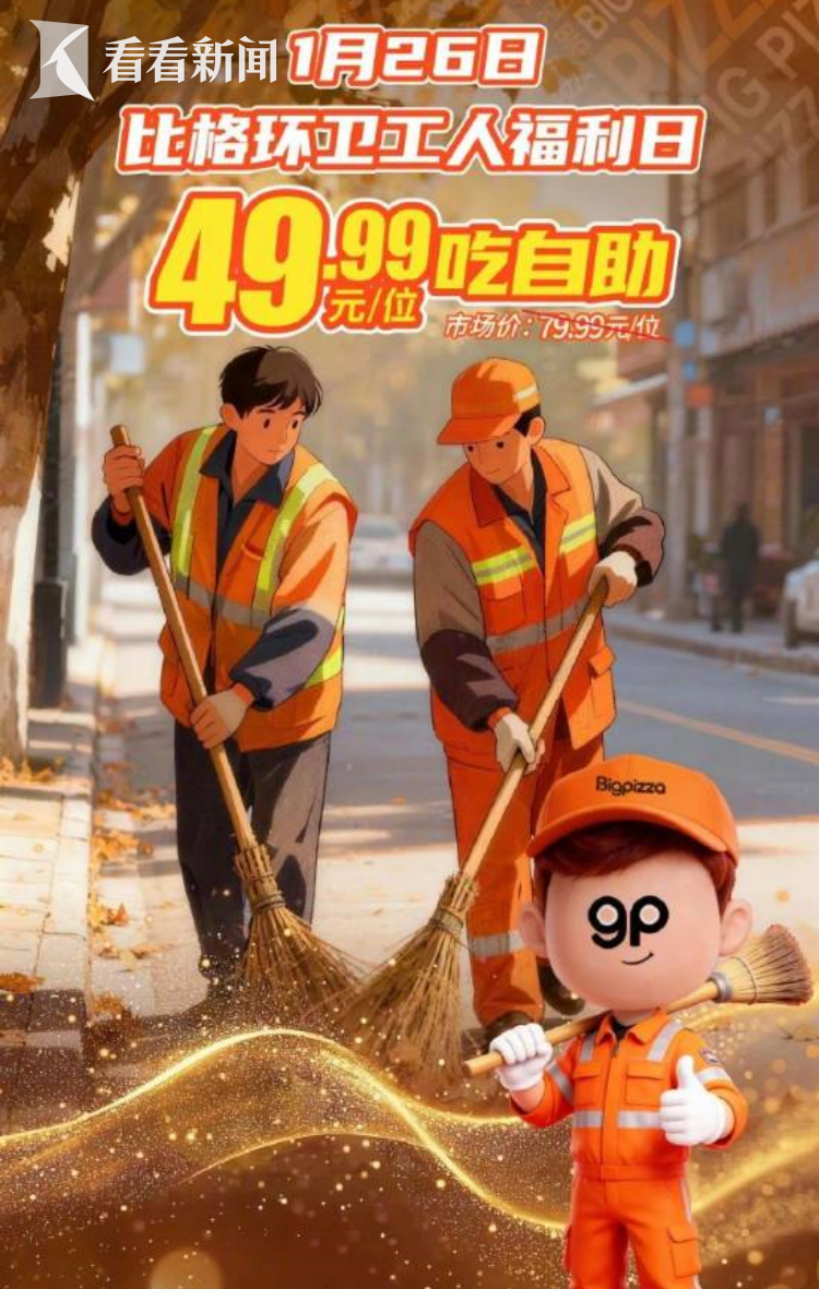 1月14日,某比萨品牌自助发布推文,宣传1月26日为环卫工人提供49.99元吃自助的福利。