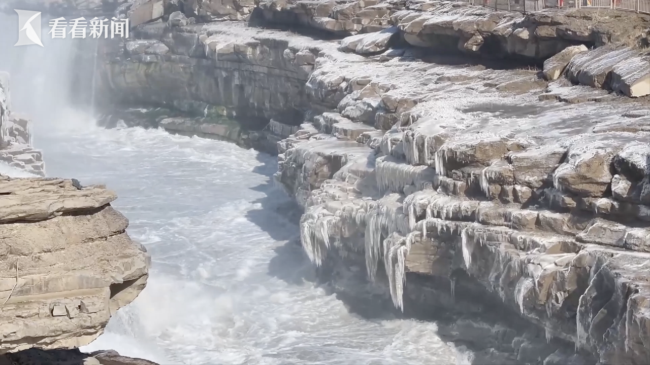 在位于秦晋峡谷的黄河壶口段,河面开始出现大范围的流凌,岸边的岩石也形成冰挂。