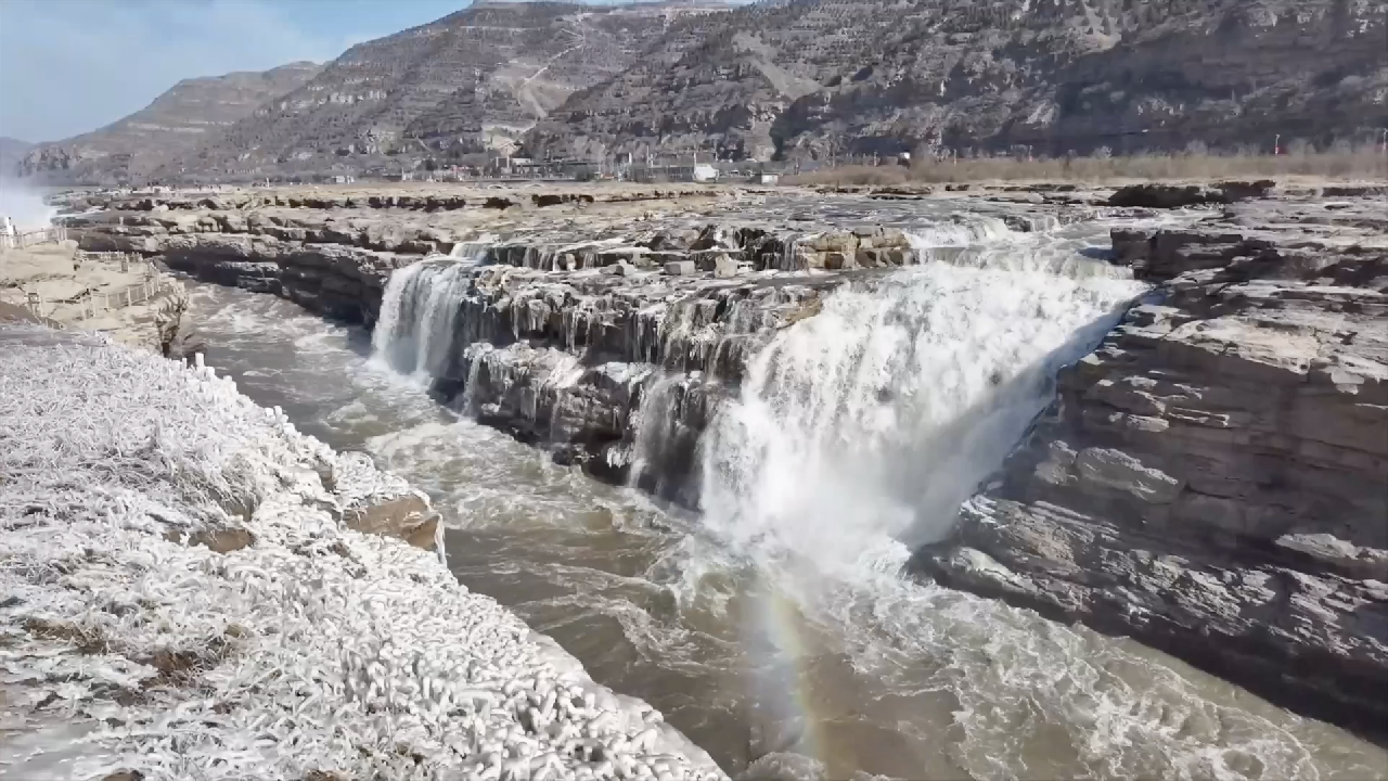 在阳光照射下,瀑布上方时常呈现彩虹与晶莹的流凌奔腾的流水相互映衬,构成一幅壮丽的冬日画卷。