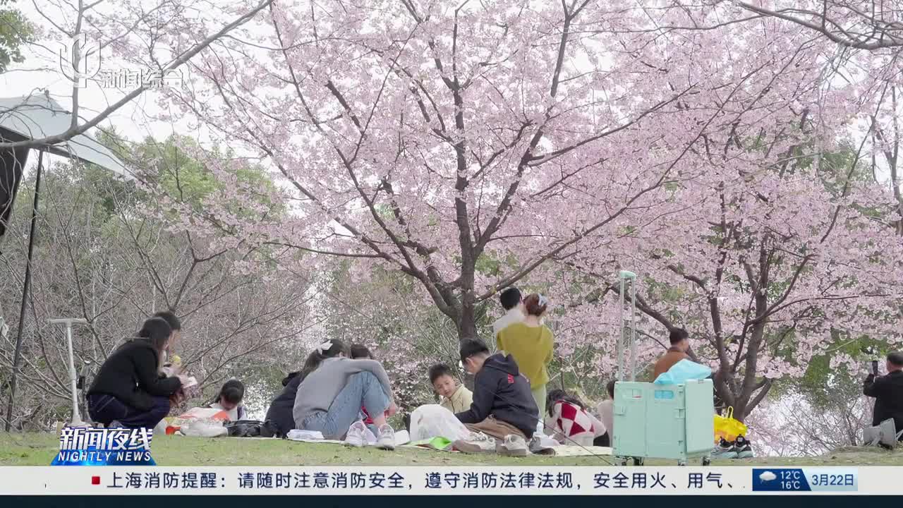 顾村公园内,层层叠叠的樱花布满枝头。树下,游客们带着野餐垫,享受着城市里的“微度假”。