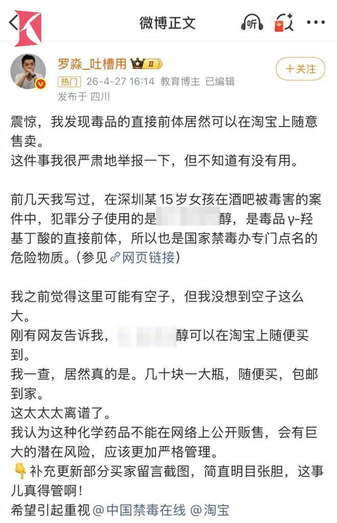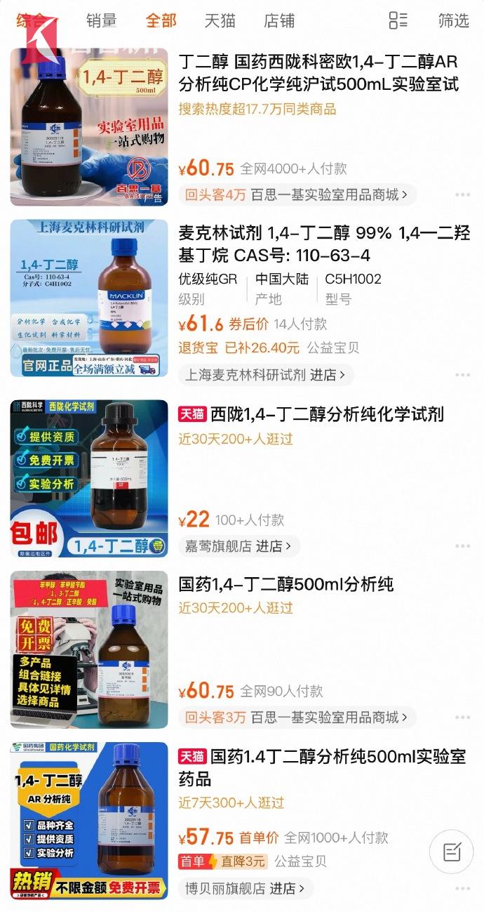 4月27日,《奇葩说》辩手罗淼在微博平台披露毒品前体1,4-丁二醇(BDO,迷奸水原料)可在电商平台随意售卖的问题,买家提问也是触目惊心——“能吃吗”“好用”“怎么戒掉”。次日,淘宝等多家平台全面下架该商品。但冷静下来需要追问:为什么一种被国家禁毒办多次点名的高风险物质,能在平台畅通无阻?