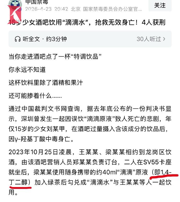 毒品前体的卖家利用列管清单的滞后性,在合法外衣下从事实质有害的行为,但事前却很难将其定性为贩毒。2023年深圳一名15岁少女,正是饮用了掺入该物质的“滴滴原液”后中毒身亡。法律对此并非完全无知。如果将毒品前体添加到食品饮料中销售,可按销售有毒有害食品罪定罪。问题在于,这种追责是事后的、被动的,而非事前的、预防性的。