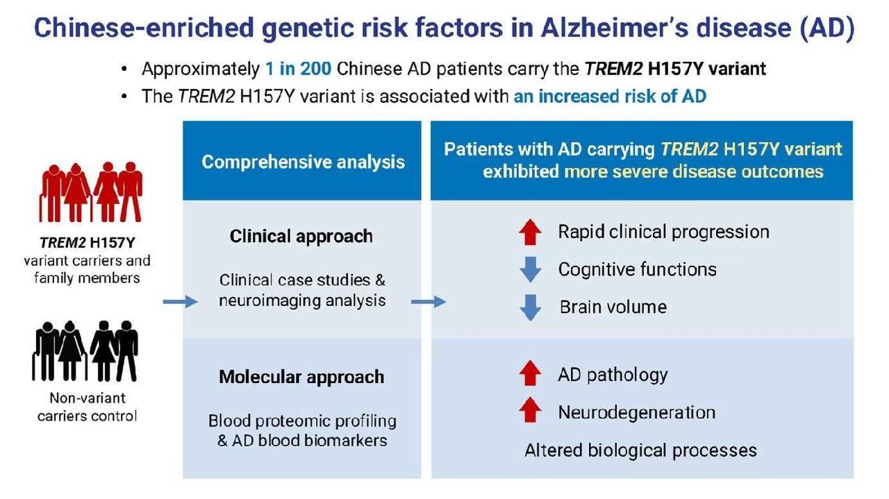 2025年10月2日,香港科技大学最新研究显示,一种名为TREM2 H157Y的遗传变异会显著增加中国人群罹患阿尔茨海默症的风险。研究发现,这种遗传变异所带来的致病风险,与目前已知最强的阿尔茨海默症遗传风险因子APOE-ε4相近,能使病情迅速恶化和带来更严重的神经退行性病变。