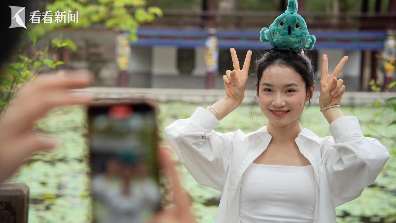 这只浑身覆盖青色短绒毛的小鸟,长着圆圆的眼睛,有着鹰钩状的鸟喙,两只小爪呈前伸状。呆萌的形象,惹人喜爱。它的名字叫“青铜啾啾”。2024年,这件毛绒玩具的销量突破八万件,销售额超500万元,成为三星堆博物馆新晋的现象级文创产品。而它也是广汉市民雪琳和小慧最爱的“毛孩子”。五一节前,两个年轻女生,带着她们的“啾啾”,来到广汉市最有名的景点雒城公园打卡。行走在城市的大街小巷中,带着青铜啾啾感受广汉最美丽的春天,两个年轻人用时下“Z时代”最流行的“带着玩偶去旅行”的方式,拍下美照分享生活。