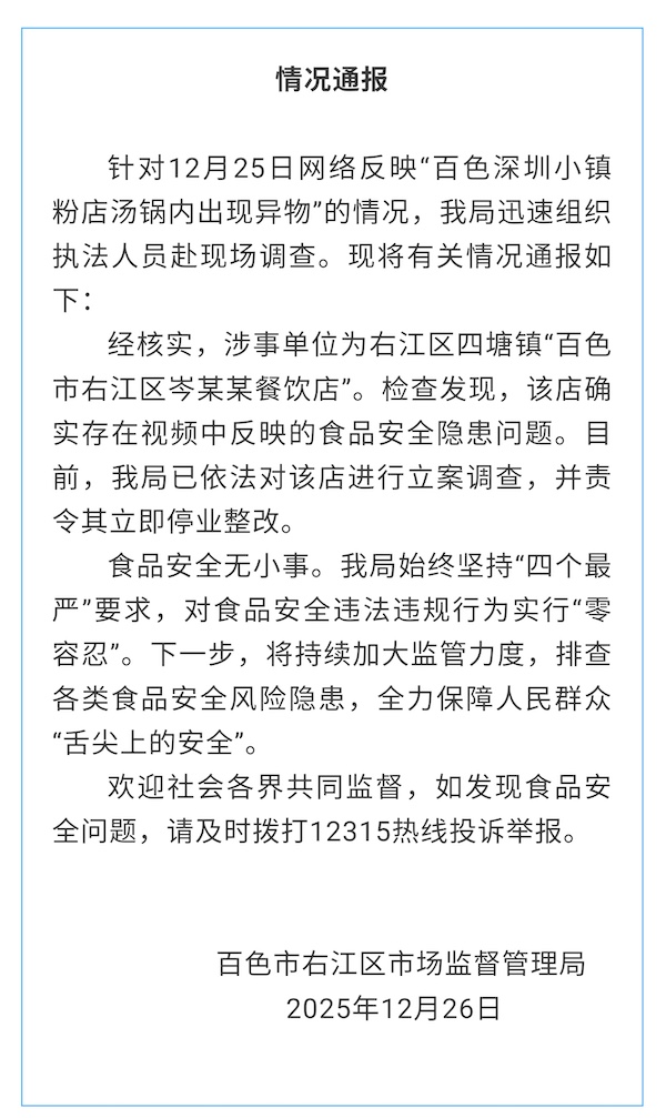 百色市市场监督管理局12月26日通报,该店确实存在视频中反映的食品安全隐患问题。目前,已依法对该店进行立案调查,并责令其立即停业整改。