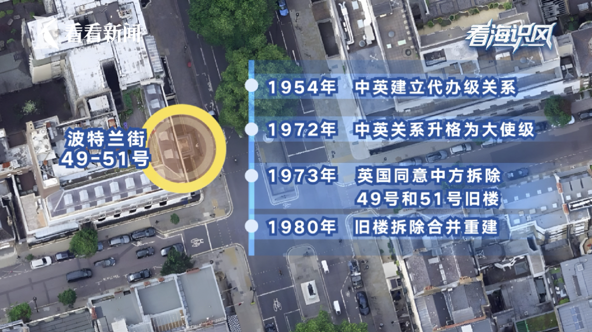 到了1926年,国民政府又把隔壁的51号给租了下来,而且两个门牌号的租期都是999年。新中国成立后,这两栋楼一度空置了一段时间。1954年,中英建立代办级关系,中方就继续使用波特兰大街上的老楼作为代办处。1972年,中英关系升格为大使级。1973年,英国同意中方拆除49号和51号旧楼,合并重建。1980年旧楼拆除,新馆不久后落成。
