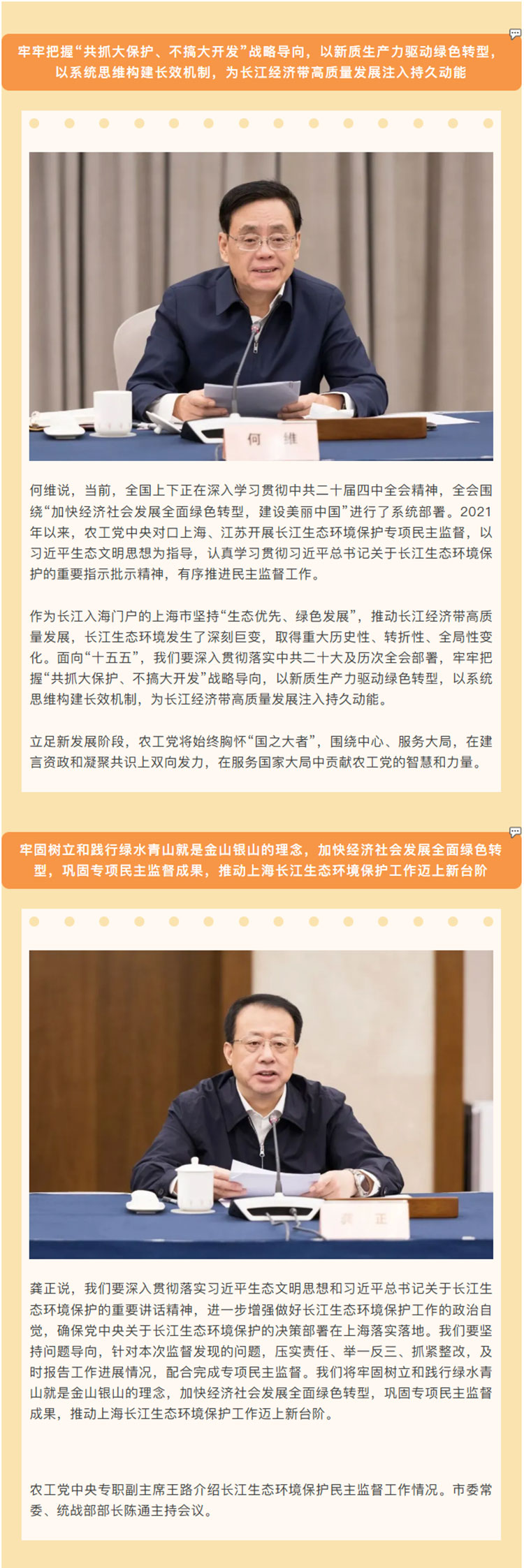 11月11日,农工党中央对口上海市开展长江生态环境保护民主监督工作座谈会举行。全国人大常委会副委员长、农工党中央主席何维讲话,上海市委副书记、市长龚正介绍上海市长江生态环境保护工作相关情况并作表态发言。