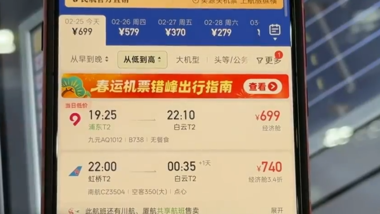 相关数据显示,2月24日至3月13日,国内航线机票平均价格约950元,比春节假期回落约13%。其中,从上海出发的机票平均价格回落约35%。