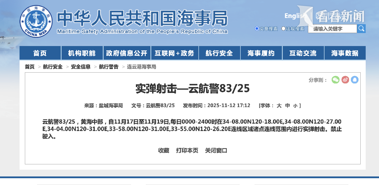 据中国海事局网站消息,盐城海事局发布航行警告: 云航警83/25,黄海中部,自11月17日至11月19日,每日0000-2400时在34-08.00N120-18.00E,34-08.00N120-27.00E,34-04.00N120-31.00E,33-58.00N120-31.00E,33-55.00N120-26.20E连线区域诸点连线范围内进行实弹射击。禁止驶入。