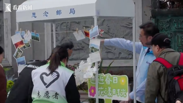 上午十点,不少市民带着鲜花,来到滨海古园进行祭扫。今年,滨海古园特意设置了好几个文明纪念区,摆上了明信片、风铃和花环。第一次陪家人来扫墓的赵先生,在明信片上认真写下对亲人的心里话,投进“时空邮箱”。