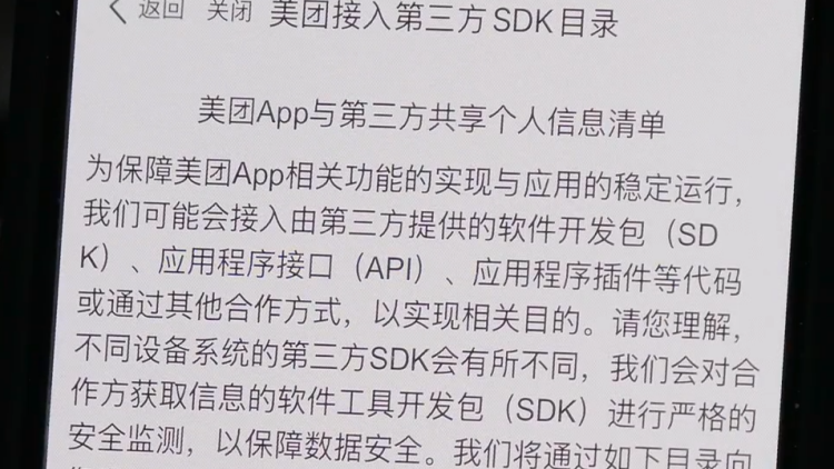 记者发现:美团App在和第三方共享信息的清单中,部分SDK具备对用户本地数据的“读写功能”。而根据我国《个人信息保护法》,数据采集和使用应遵循最小必要原则。目前,美团表示,相关漏洞已经修复,将全力协助用户找回丢失数据。