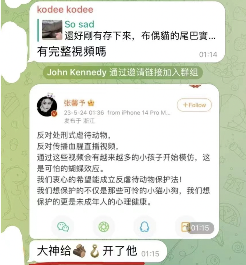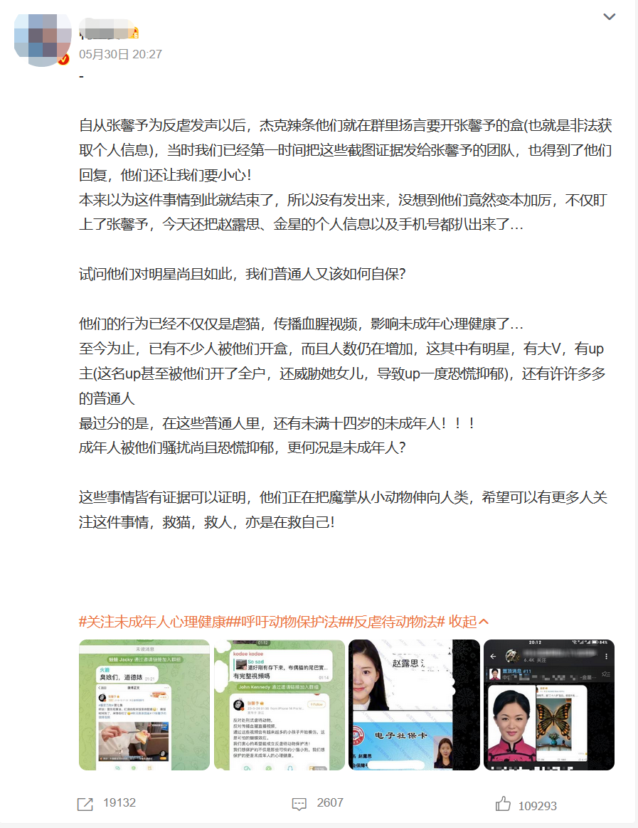 上述博主称,因张馨予为反虐待动物发声后,被不法分子盯上,还扬言要“开盒”张馨予(非法获取个人信息),自己已经第一时间把这些截图证据发给张馨予的团队,并得到了回复。