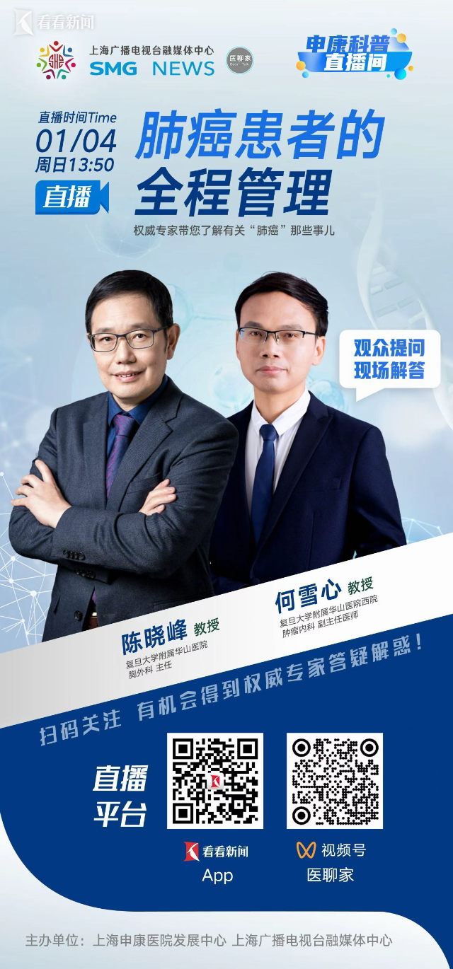 为此本期节目中,我们非常荣幸地邀请到复旦大学附属华山医院胸外科主任陈晓峰教授、复旦大学附属华山医院西院肿瘤内科副主任医师何雪心教授做客直播间。