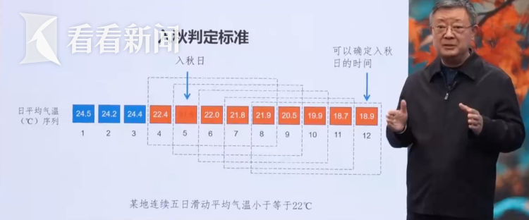中国气象局气象宣传与科普中心特聘专家朱定真表示:为了保证不是受一两次冷空气的降温的影响,所以叫5天滑动平均气温。也就是说从某一个日期开始,我们以5天的滑动逐渐来测温度,直到所谓低于22℃的这个温度出现了5天以上,如果是连续的,那我们就倒回头,这5天里面的第一天就作为入秋日期。
