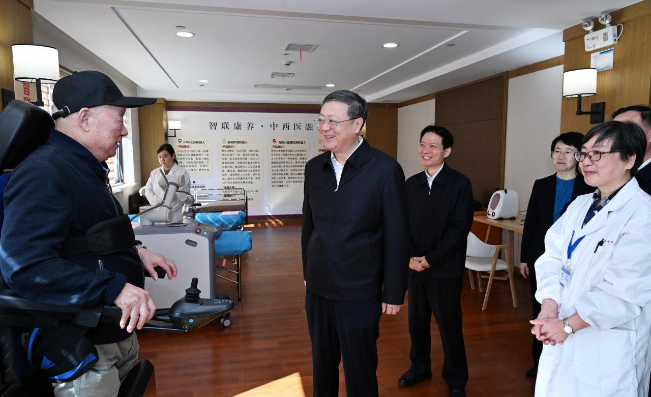 今天上午,陈吉宁来到闵行区虹桥镇敬老院看望慰问老年人,察看智慧医养平台和养老服务设施,了解综合照护及员工制管理工作情况。这家敬老院着力打造集机构照料、医养结合、短托及家床服务于一体的养老服务综合体,积极探索紧密型医养融合、机构与社区融合,一站式解决周边居民养老需求。在医务室、配药室,社区医护人员为老人提供诊疗服务,帮助老人通过互联网医疗复诊配药;在康复室,多种高科技设施辅助老人进行复健训练。