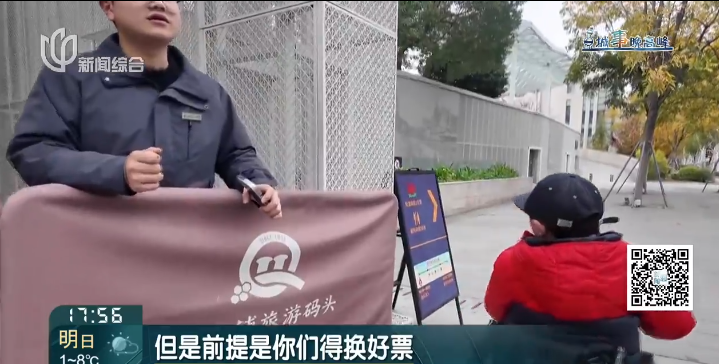 中午,坊记与小朱来到了十六铺1号码头,户外的售票亭门窗紧闭。一旁入口处的工作人员告知,乘坐轮椅的人士登船,必须持有纸质船票,即便已在网上购票,也需要前往地下一层的售票大厅进行换票。
