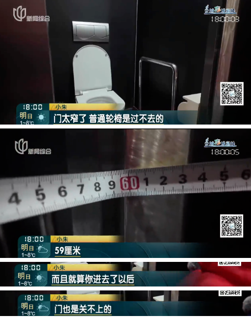 门太窄了,普通轮椅是过不去的,(这里只有)59厘米,正常一个无障碍厕位门框的话要有80厘米,而且就算进去了,门也是关不上的,其实它只是一个适老化的厕位而不是无障碍的厕位。我们看门上它挂了一个残疾人专用,应该是标错了,这个空间和门宽是不足以让轮椅进去的。
