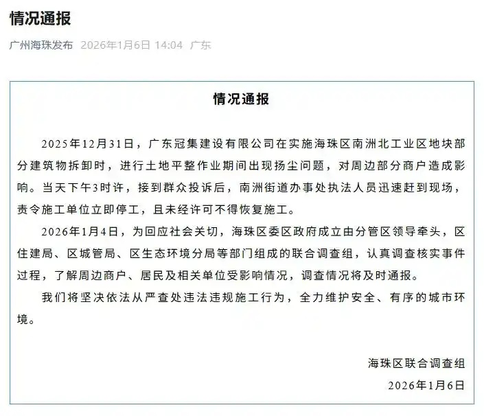 面对“扬尘逼迁”的质疑,南洲街道最初回应称,系雾炮机“操作失误”,“设备未及时加水,导致降尘变扬尘”。1月6日,海珠区官方通报指出,2025年12月31日,广东冠集建设有限公司在实施海珠区南洲北工业区地块部分建筑物拆卸时,进行土地平整作业期间出现扬尘问题,对周边部分商户造成影响。当天下午,当地街道已责令施工单位立即停工,且未经许可不得恢复施工。通报还称,已成立由区住建局、城管局、生态环境分局等部门组成的联合调查组,将坚决依法从严查处违法违规施工行为。