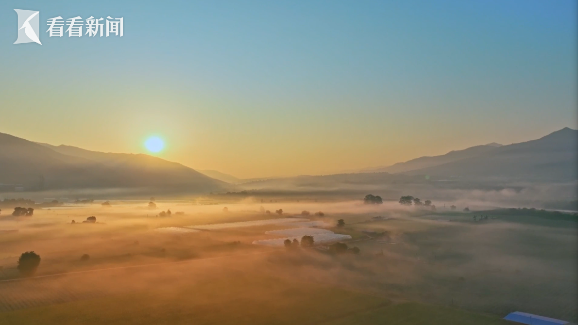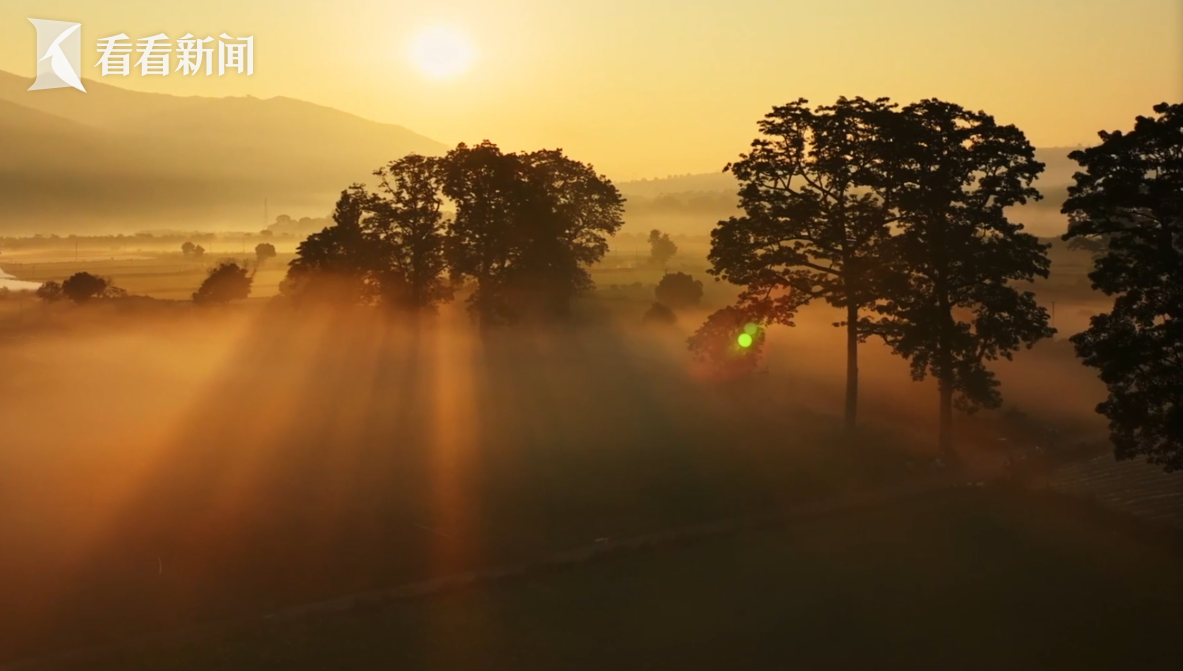 当阳光倾泻时,雾与江水遍镀金辉,与连绵的群山交织成一幅清雅壮阔的山水画卷。