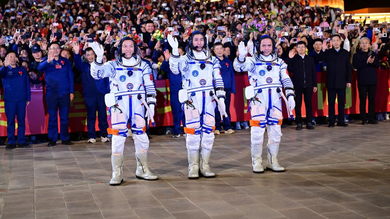 张陆、武飞、张洪章3名航天员乘车在礼宾摩托车队的护卫下前往发射场。现场国旗飘扬,群众深夜守候夹道欢送,舞龙舞狮锣鼓喧天。