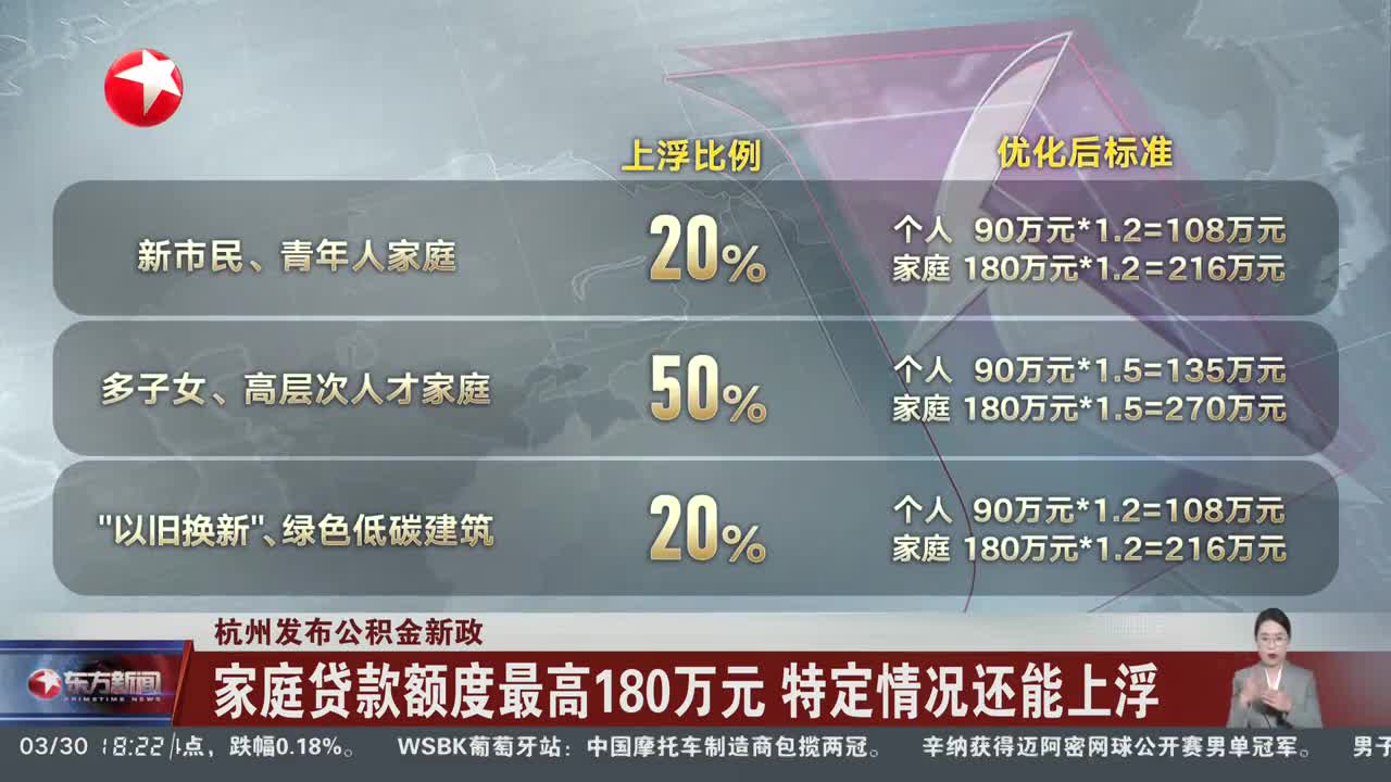 杭州发布公积金新政 家庭贷款额度最高180万元 特定情况还能上浮