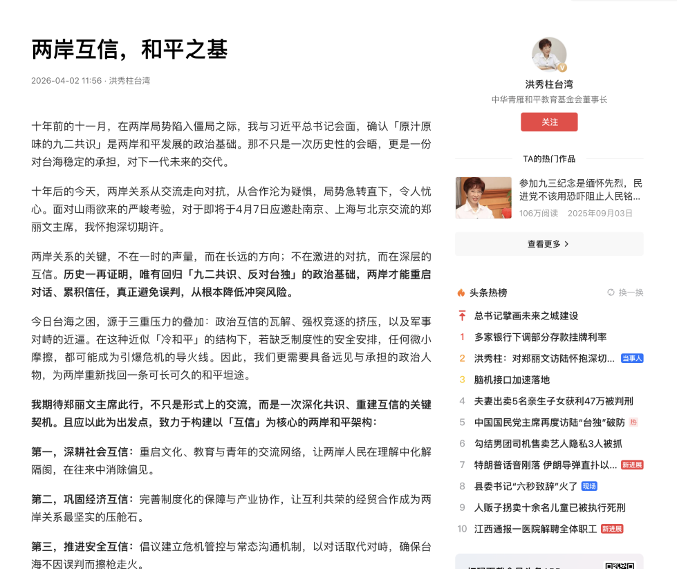 距离中国国民党主席郑丽文访问大陆还有不到一周时间,这是自2016年时任国民党主席洪秀柱访陆后,时隔近十年,国民党主席再度访陆,两岸都在期待。关键节点,洪秀柱发文点透政党对话的核心价值。