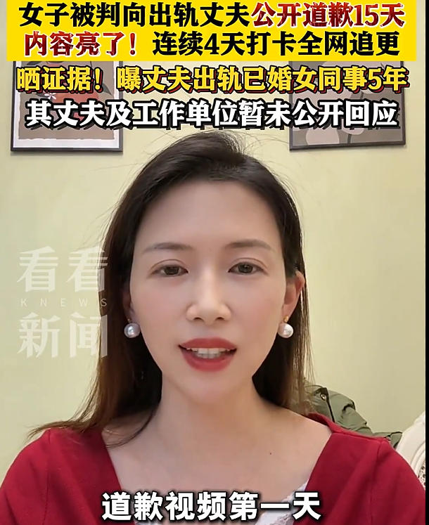 近日,河南女子牛娜在抖音连续多天发布向丈夫的公开道歉视频,引发网友关注。其称因丈夫与已婚女同事持续5年婚外情,自己在社交平台曝光二人姓名、工作单位及消费证据等,遭丈夫起诉侵犯名誉权,法院判决牛娜需连续15天公开道歉。自1月12日起,牛娜已连续发布4天道歉视频,以“服从判决”名义开启“道歉连续剧”,单条视频点赞量超50万。视频附上了丈夫为第三者购买奢侈品的消费记录,以及法院判决书和此前她发布的侵权内容,反讽丈夫“满足职工物质与生理需求”“两人是真爱”等,相关内容持续引发热议。