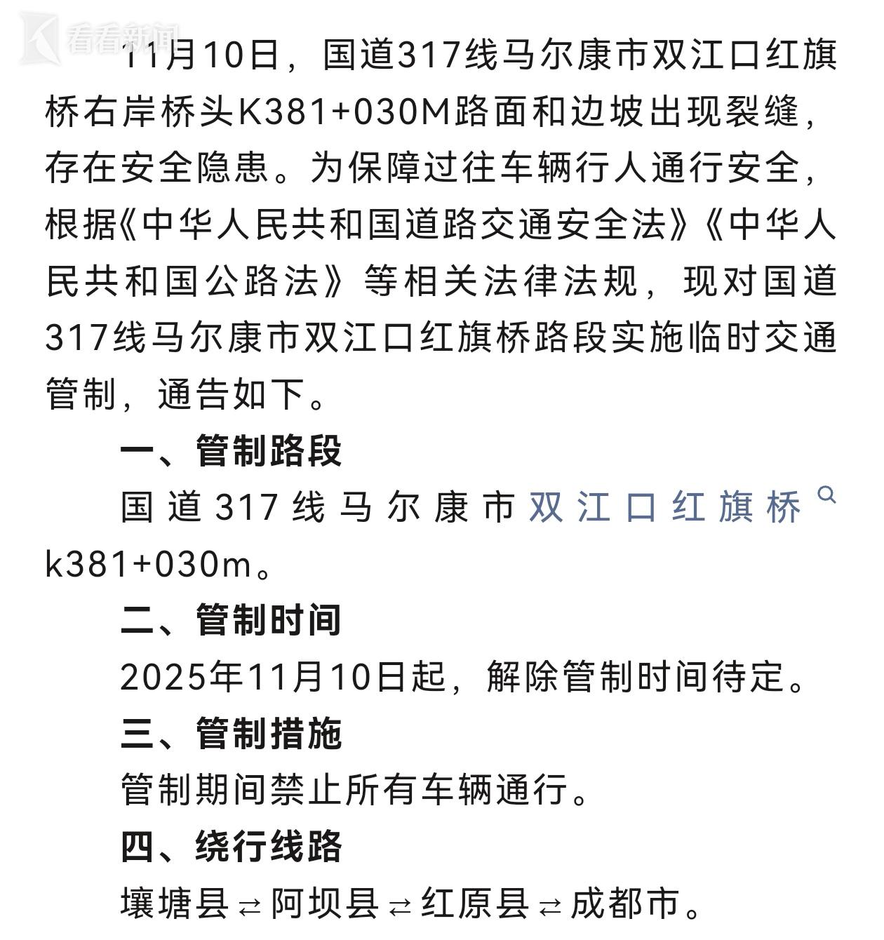 据当地巡查时发现,11月10日17时25分,马尔康市白湾乡境内红旗桥右岸桥头G317路面两侧和木尔基库周路路面均发现约10cm宽主裂缝,山体开裂处距G317红旗桥右岸桥台约30米,在库周交通侧约50米。在发现险情后,当地立即启动应急响应机制。公安、交通、自然资源等部门,立即赶赴现场进行应急处置。11月10日23时,滞留车辆全部疏散完毕,并在现场设置警示标志,严控无关人员进场。阿坝州公安局、州交通运输局共同发布红旗桥临时交通管制通告,安排警力设置远端分流点3个,近端管制点2个,并与壤塘县、红原县、阿坝县建立联动机制,合力做好区域交通疏导。即日起,从成都前往壤塘县,需从红原县、阿坝县绕行。目前,当地已邀请专业力量进行现场踏勘,安装监测设备,并对库区周边山体开展全面隐患排查,严防次生灾害。