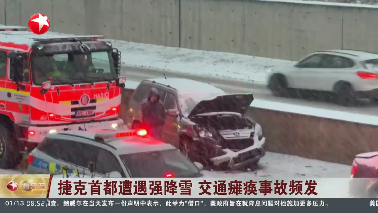 捷克首都遭遇强降雪 交通瘫痪事故频发