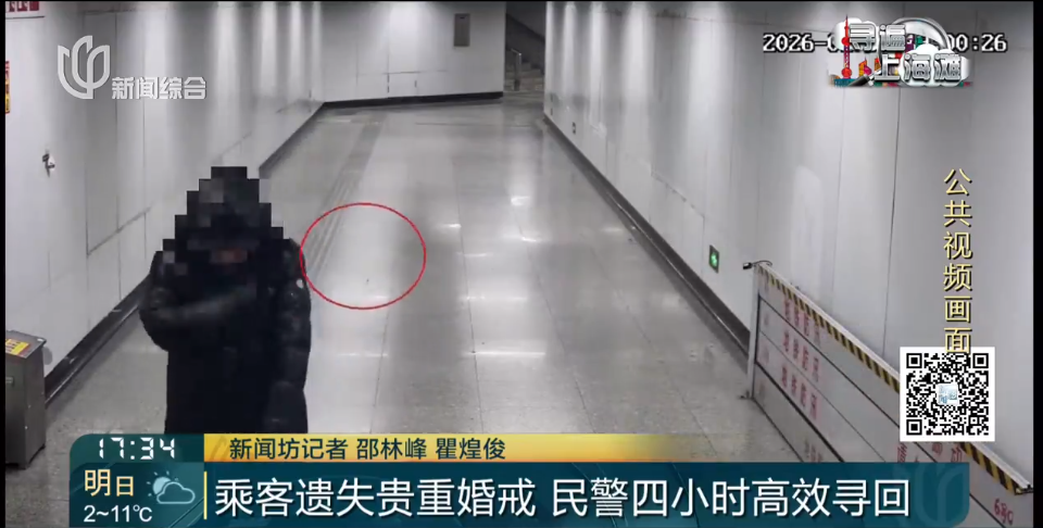 了解情况后,民警立即陪同失主前往出入口处寻找,却没有任何线索。随后,民警又调取站内多角度公共视频,终于有了新发现。画面显示,当时失主在进站时,用力甩动袖子,抖落外套上的雨水,就是在这时,不慎将佩戴的婚戒甩落了。