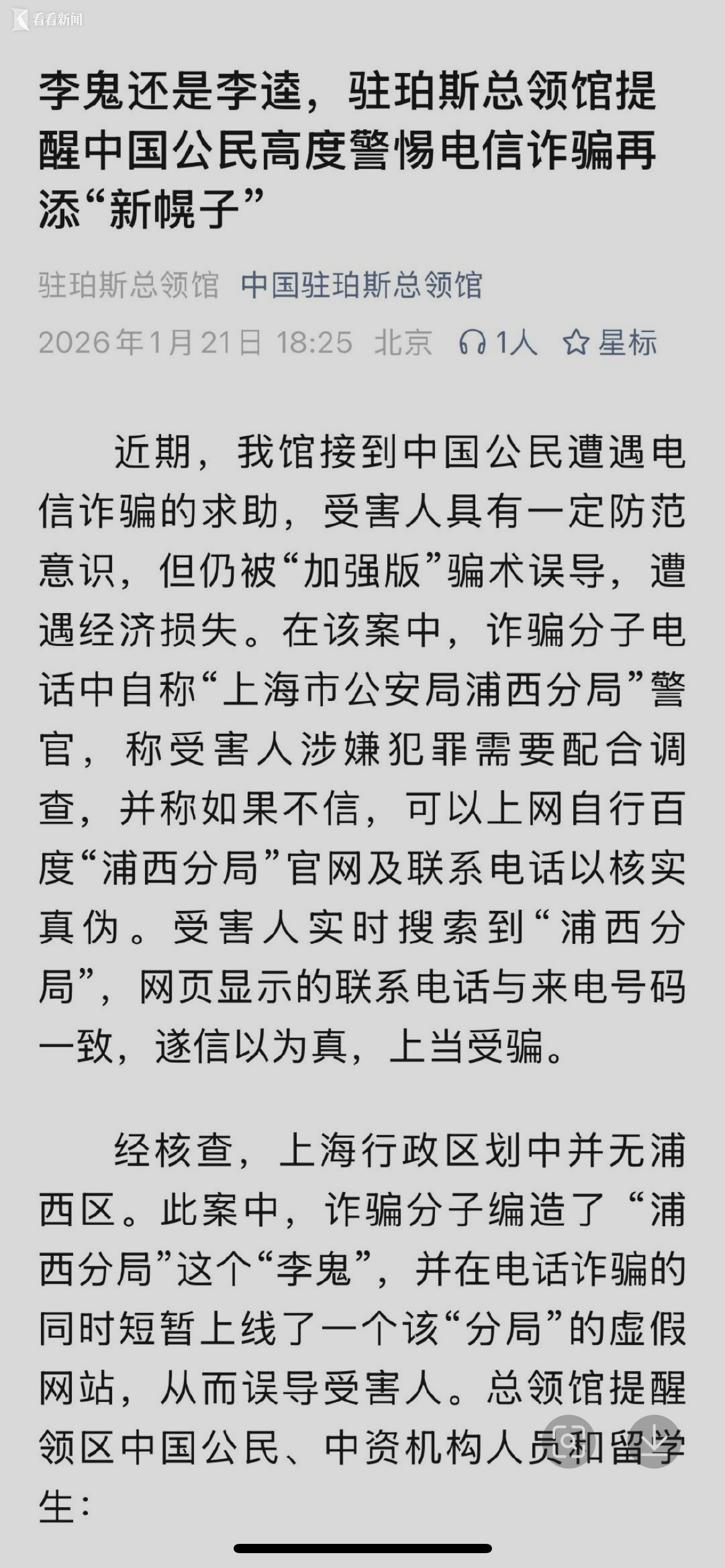 1月21日,中国驻珀斯总领馆发布提醒称,近期接到多起中国公民遭遇电信诈骗的求助。