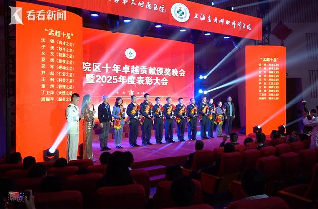 12 月 30 日,海军军医大学第三附属医院嘉定院区十年卓越贡献颁奖晚会暨 2025 年度表彰大会顺利举行。大会以“二次创业强军梦,五次腾飞铸辉煌”为主题,采用线上线下相结合的形式,主会场设在国家肝癌科学中心报告厅,全院各科室设分会场,大学及驻地嘉定区、杨浦区、安亭镇、昆山市政府及各事业单位,同济大学、上海市申康中心、上海市医师协会,医院“引才联络站”高校,医院“肝胆联盟”代表单位等各级领导、68 家共建单位代表及人民网等 21 家媒体单位,医院党委委员、各级骨干和员工齐聚大会共襄盛举,线上同步观看人数超千人。