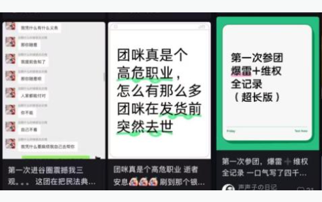 记者在调查中发现,“谷圈”内部发生过多起大型的代购跑路事件。其中,一个名为“谷子小卖部”的群主,收取了600多人的货款20多万元,却一年都没有发货。面对代购卷款跑路,受害者们只能曝光账号发避雷帖、封禁代购的支付账号,但很难真正追回损失。这些拼团“买谷”的链接,大多源自“拼团呀”微信小程序。几乎所有的拼团链接都在这里生成,所谓的团长则通过社交媒体“宣团”引流,将散落的爱好者们,聚进一个个微信或QQ群,完成下单。