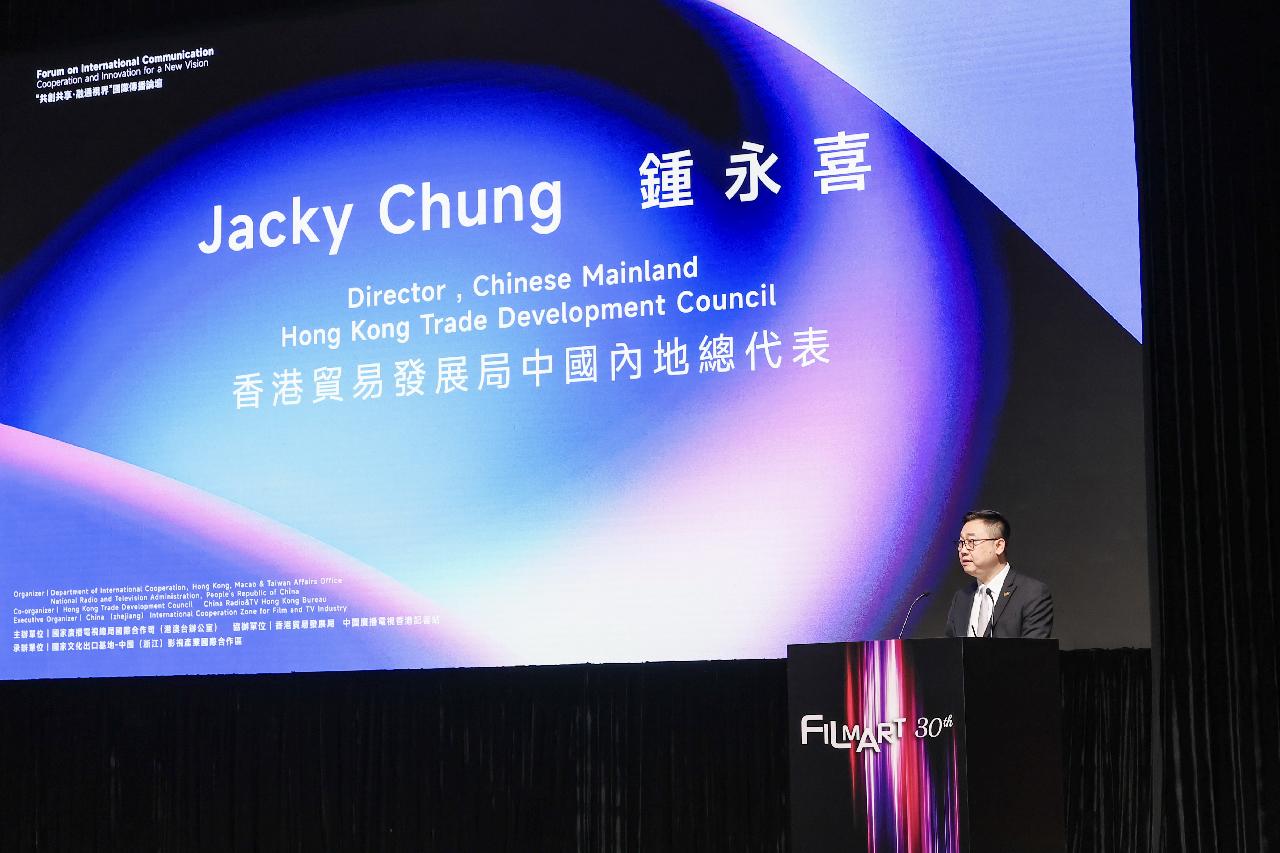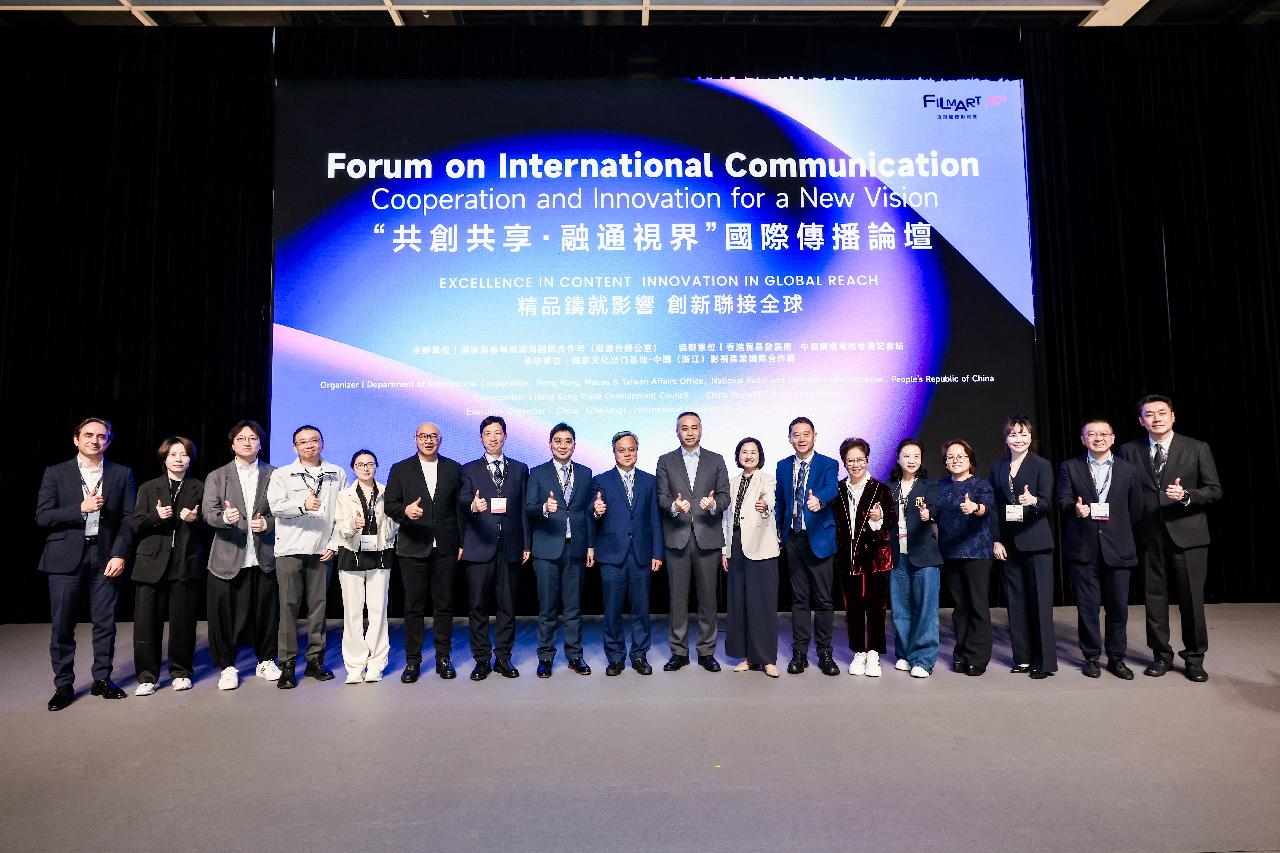 3月17日,“共创共享·融通视界”国际传播论坛在第30届香港国际影视展期间举行。论坛以“精品铸就影响,创新联接全球”为主题,深度聚焦精品内容创作、科技赋能创新、国际合作传播等领域,共同探讨视听内容全球化传播的新趋势。中央人民政府驻香港特别行政区联络办公室宣传文体部副部长林枬,香港电台广播处长关婉仪,香港贸易发展局中国内地总代表钟永喜以及来自香港电视广播有限公司,澳门广播电视股份有限公司等机构的近300名代表参加论坛。