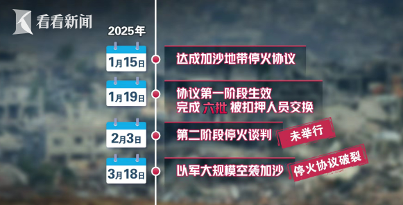 第二阶段停火谈判原定于2月3日开始,但双方一直未举行实质性谈判。3月18日,以军单方面宣布恢复对加沙地带的大规模军事行动,停火协议就此破裂。